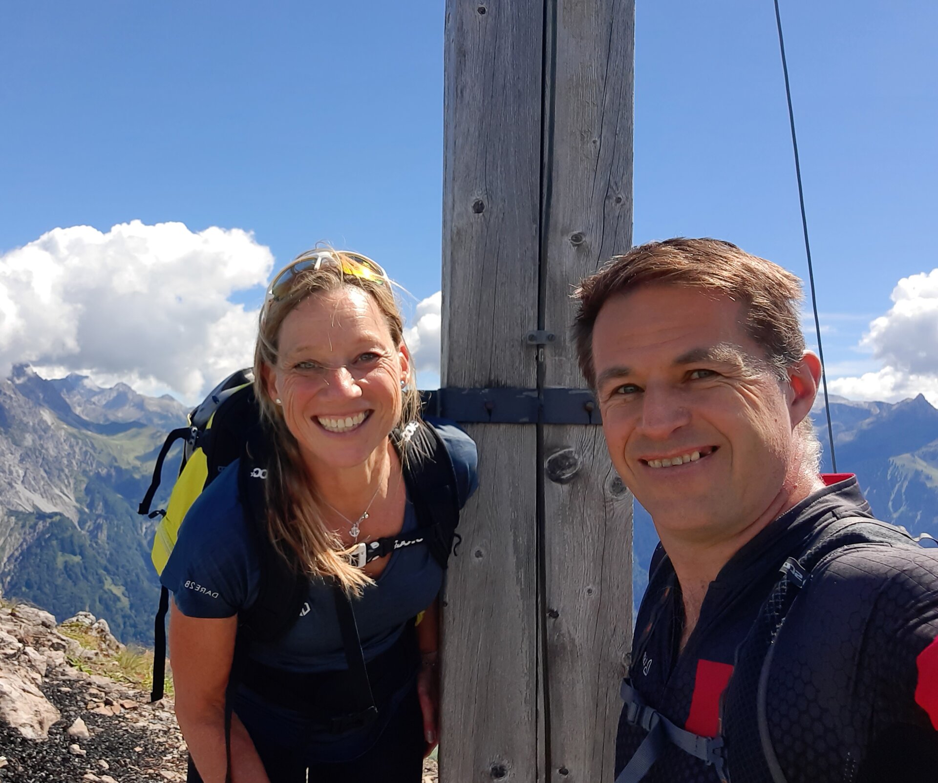 Michael nennt mir dennoch ein paar Gipfel: Gegenüber die Rote Wand im Lechquellenbegirge, da die Silvretta mit dem Silvrettahorn und Großlitzner, dort die Gargellner Köpfe, rechts der Rätikon mit der Sulzfluh und den Drei Türmen, und dort Zimba und Schesaplana…