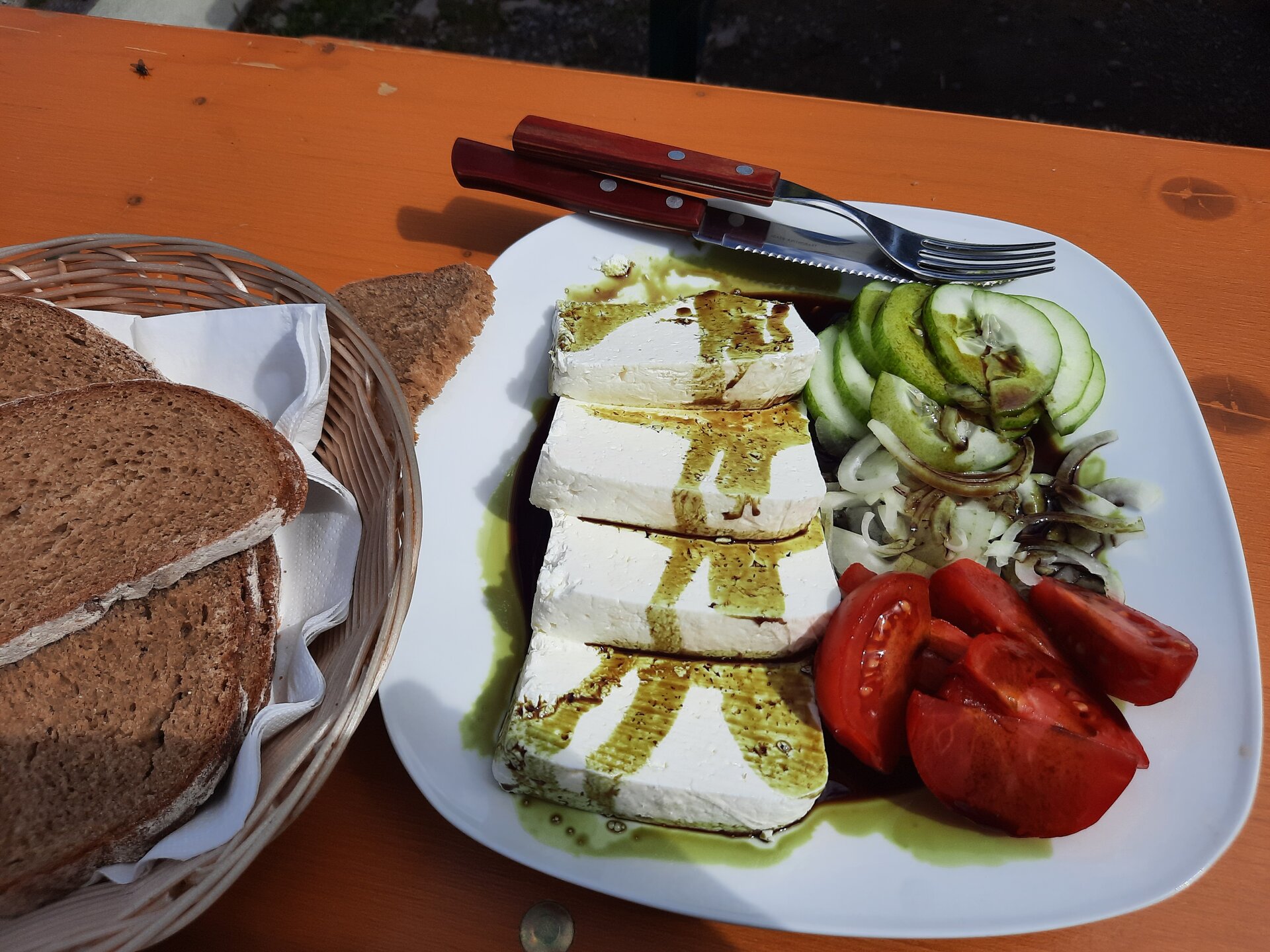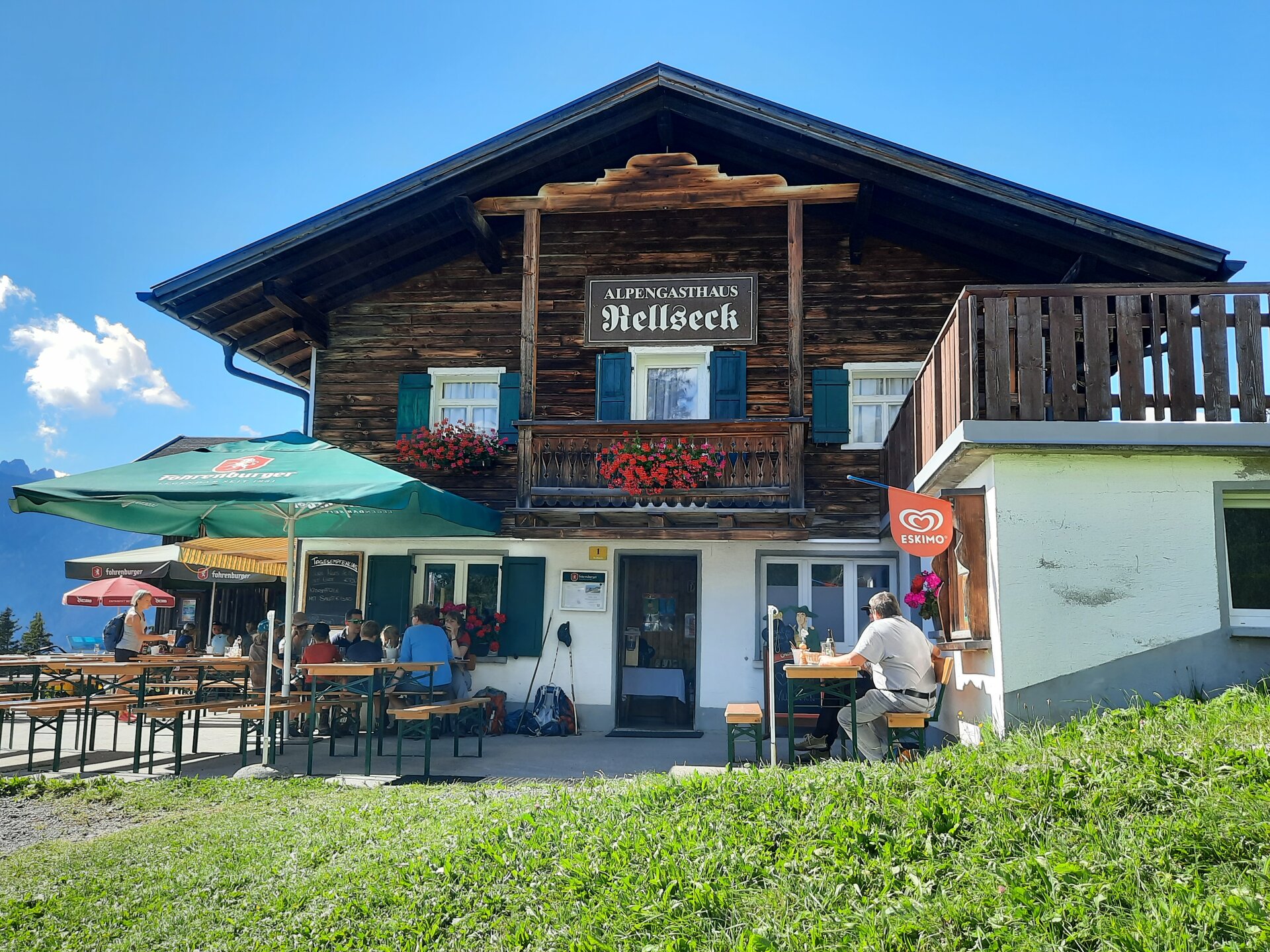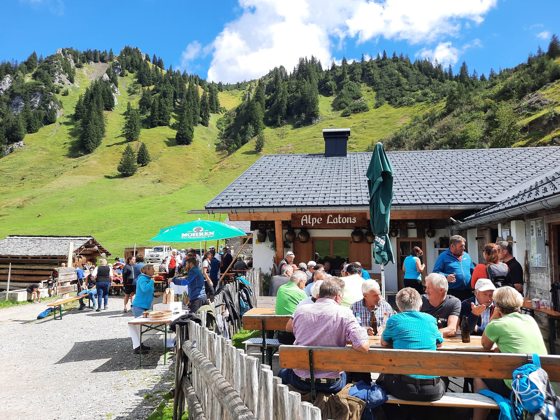 Das bringt mich dann auch gleich auf einen Gedanken: Eine Einkehr wäre jetzt genial! Das Alpengasthaus Rellseck wartet ja. Aber heute scheint unten auf der Alpe Latons ein Wanderfest zu sein. Wir hören Alphörner und sehen einige Wanderer und Einheimische bei regionalen Köstlichkeiten gemütlich zusammensitzen. Klar, dass wir dort mal schnell vorbeischauen wollen, mit E-Bikes ist man ja auch fix wieder oben. Michael erklärt dabei, dass er mit seinen Gästen weitegehend flexibel reagieren kann. Wenn man hier an der Alpe Latons kurz vorbeischauen will, ist das auch okay. Oder wenn hier einige warten wollen, während die anderen mit dem Guide zur Davenna laufen.