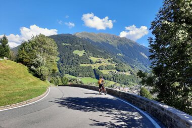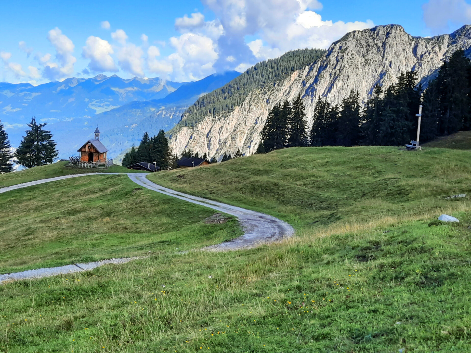 Zurück geht’s mit dem E-Mountainbike zum Rellseck, wo der Montafoner Sura Kees und ein Johannisbeerschorle locken. Mit frischer Power fahren wir anschließend auf dem Schotterweg mit spannender Variante hinunter bis nach Bartholomäberg. Vorbei an der barocken St. Bartholomäus Kirche mit der Zwiebel auf dem Turm, bis wir an Infotafeln gelangen. An dieser Stelle, im Friagawald, kamen bei Ausgrabungen eine bronzezeitliche Burganlage und Siedlung zum Vorschein.