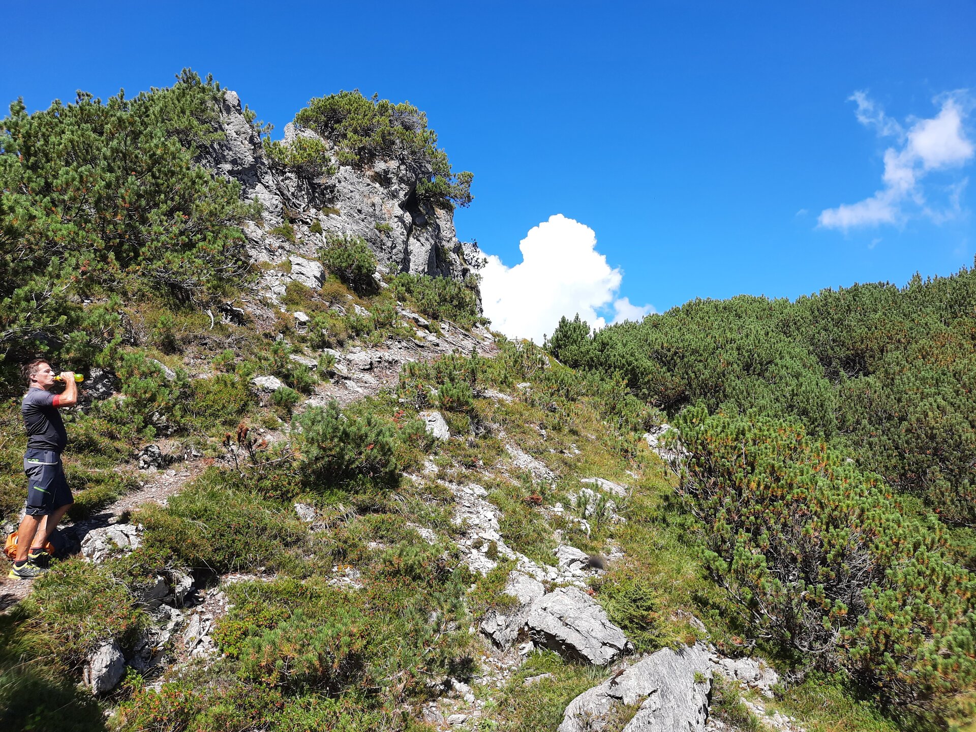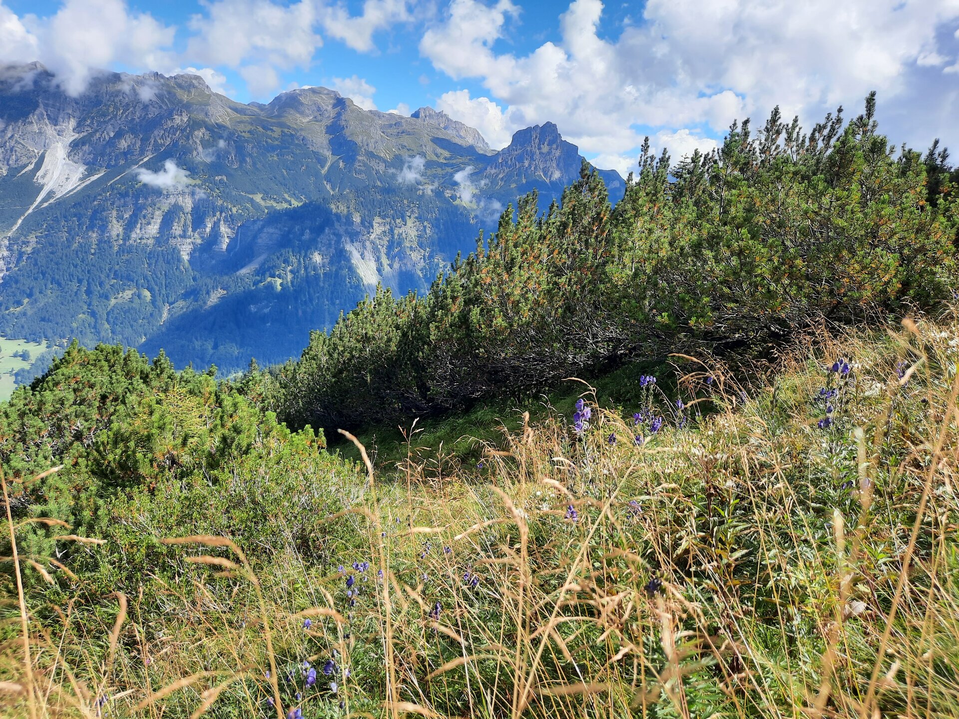 Wir steigen ein kurzes Stück am Wiesenhang hinab, mit Ausblick auf die Itonskopfgruppe und auf die Alpe Latons, um kurz darauf auf schmalem Pfad links abzubiegen. Es ist ein toller Weg; abwechslungsreich, inmitten vom satten Grün, Alpenblumen und Latschenkiefern – und ab und zu zeigen sich Gipfelkreuze vor uns: der Zwölferkopf und links versteckt unser Gipfel: die Davenna. Im leichten Auf und Ab ist der landschaftlich reizvolle Weg nie anstrengend, insgesamt sind bis zum Gipfel nur knapp 250 Höhenmeter zu bewältigen. Bald ein kurzer Anstieg über Gestein, das eine kleine Geschichte beherbergt. Wie ich von Michael erfahre, liegt hier eine der seltenen Stellen vor uns, wo Kalk mit Muschelschalen auf dem Flysch als Fossilreste zu finden sind. Zeitzeugen aus dem Meer, die vor 25 Mio. Jahren durch den Zusammenprall der Kontinente Afrika und Europa nach oben geschoben wurden.