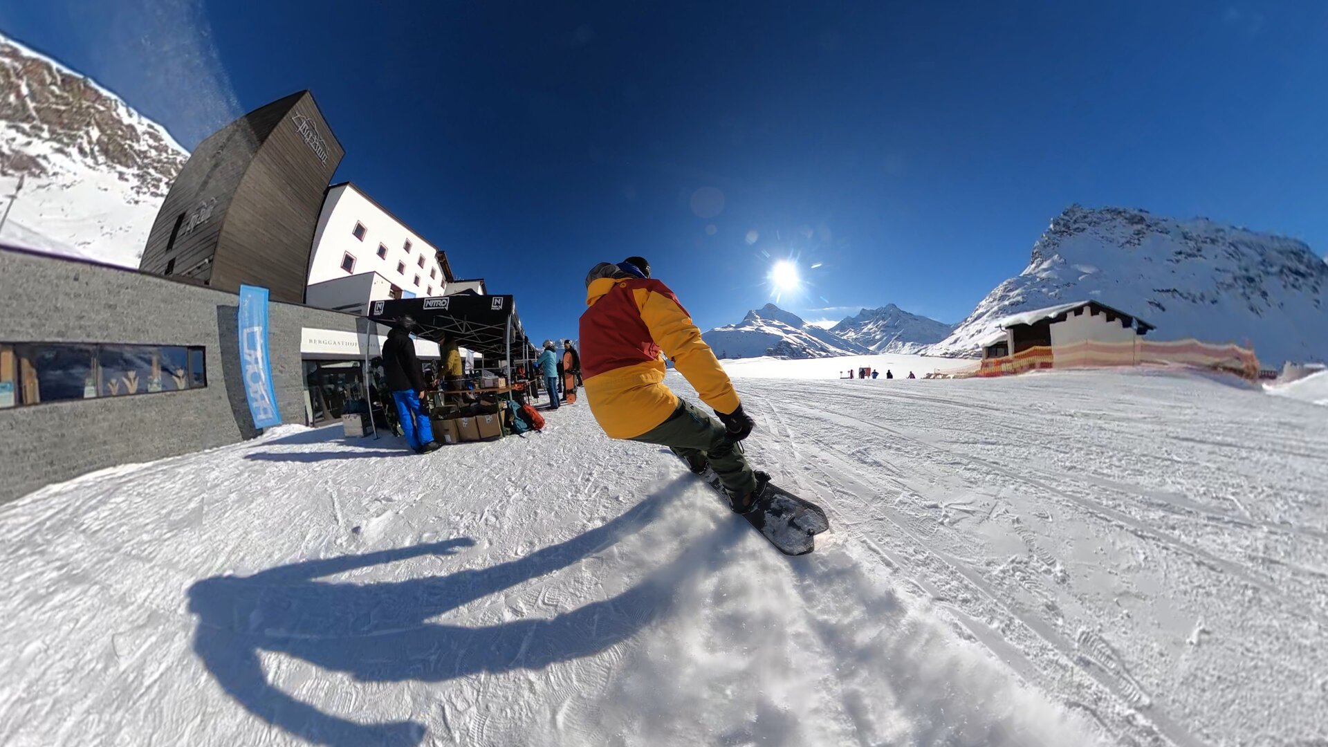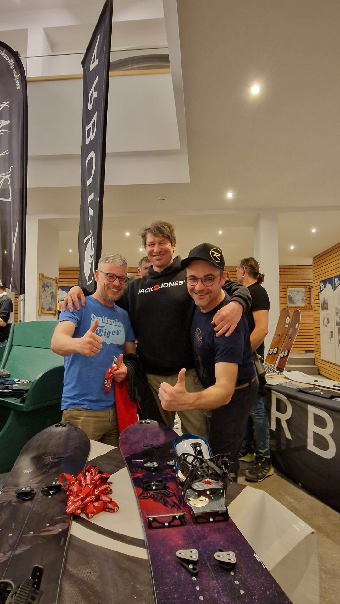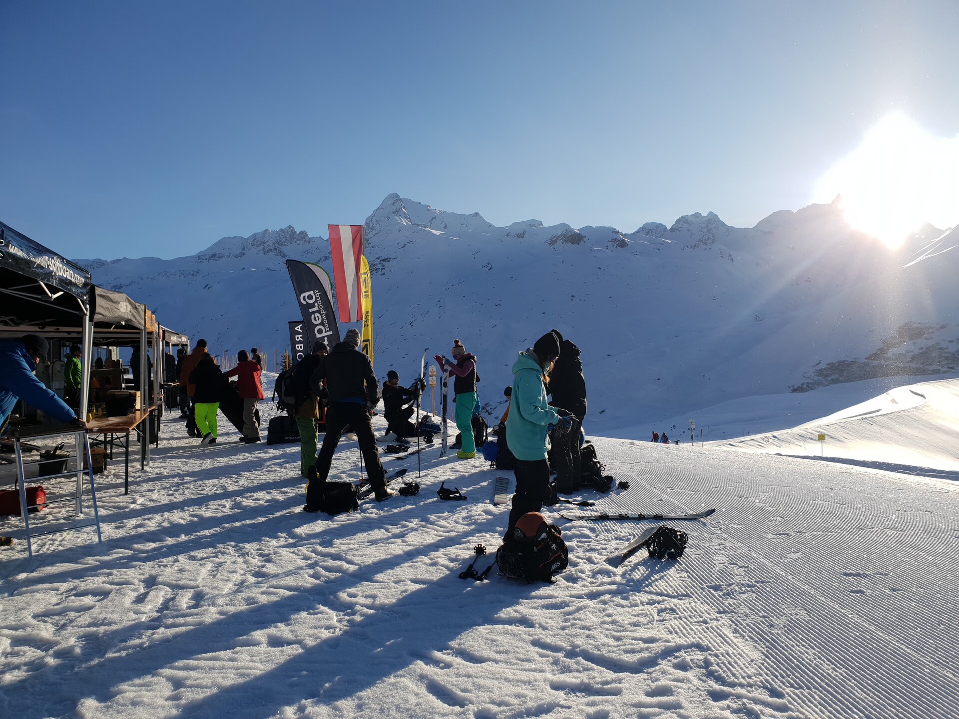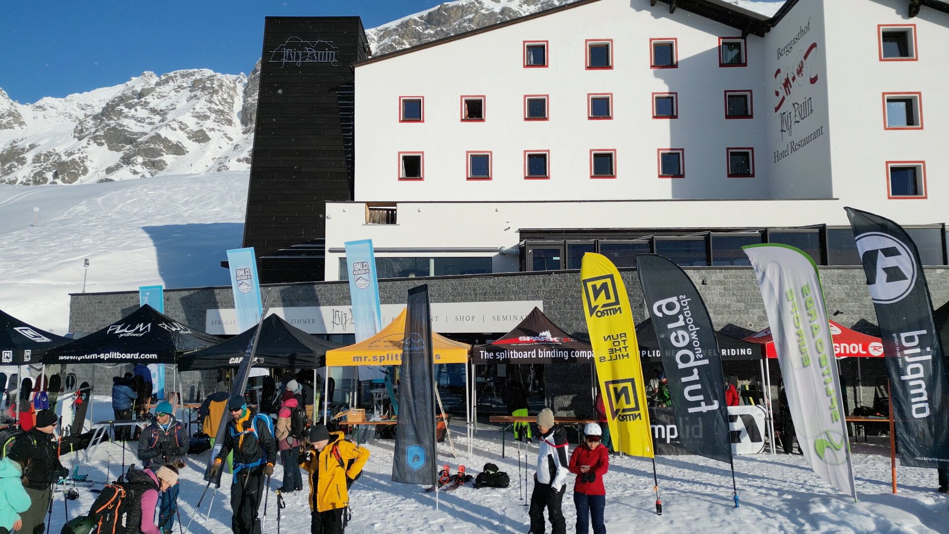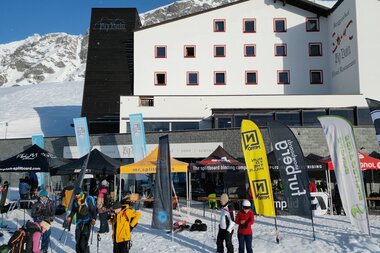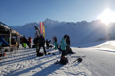 …heißt es nach dem Abendessen am Freitag im großen Foyer bei der Ausstellung der Partnerfirmen mit ihren Splitboards und Bindungen. Und am nächsten Morgen gehts bei der großen Mountain Expo direkt vor dem Berggasthof mit eigenem Lift, dann ans ausgiebige Testen, Fragen und Austauschen. Hier sind auch weitere Gäste herzlich willkommen, die vorab ein Day Ticket kaufen, also nicht auf der Silvretta-Bielerhöhe übernachten. Da jede Testerin und jeder Tester dank der fleißigen „Schrauber“ und der großen Auswahl bis zu acht verschiedene Boards vergleichen kann, ist im Zeltdorf ein fröhliches Treiben und Austauschen. Übrigens findet man auf der Seite von unserem Partner Powderguide Tipps von Simon, wie man für sich persönlich das beste Material bei solch einer großen Testival-Auswahl findet.
