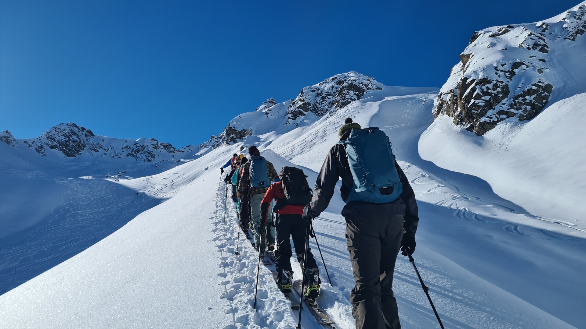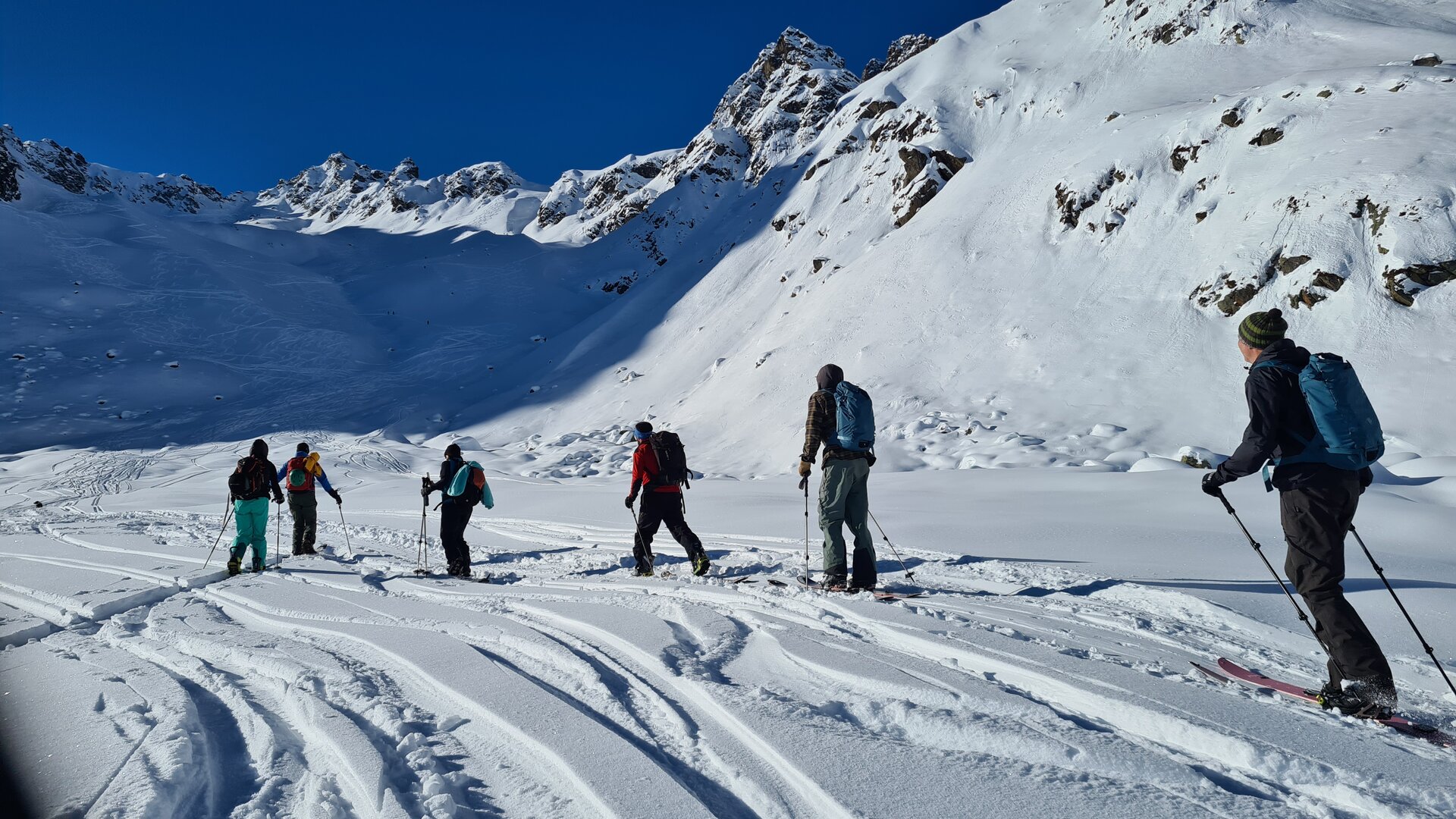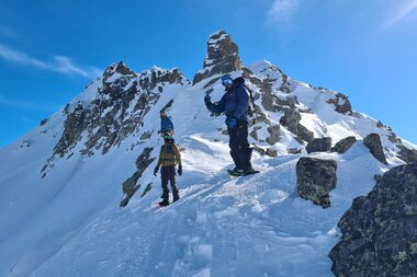 Am Sonntag sind alle immer früh und motiviert auf den Beinen, um den Tag zu nutzen. Dank dem Gepäckservice von Splitboards Europe für alle Gäste und die Industrie kann jede und jeder in den Schnee. Hier auch wieder wahlweise mit Guide oder auf eigene Faust. Die Gruppen nutzen je nach Schnee- und Wetterbedingungen das Touren-Eldorado voll aus und verteilen sich meist auf Hennekopf-Tour, Kromer Scharte, Schweizer Lücke und unbenannten feinen Nordhängen.