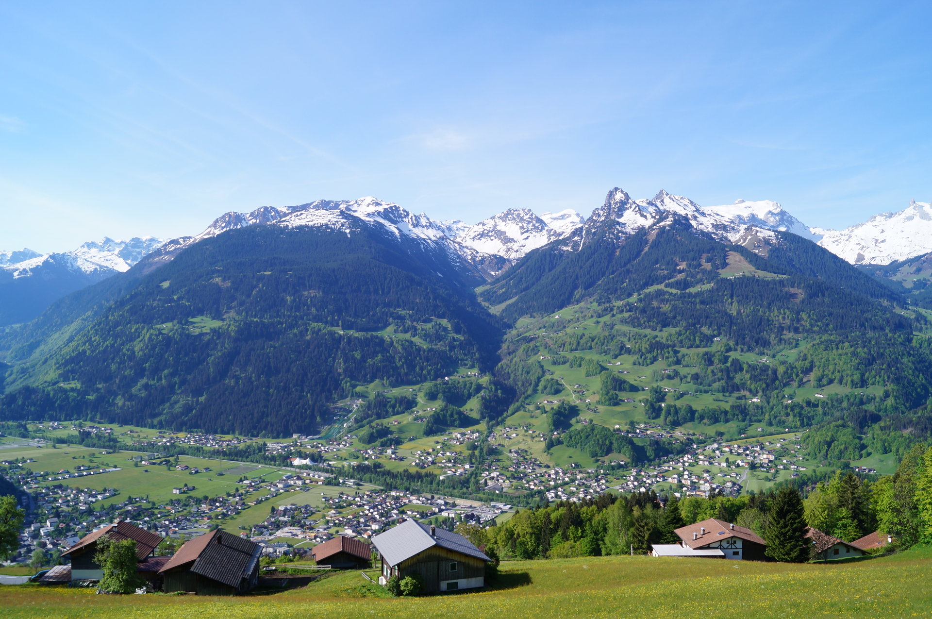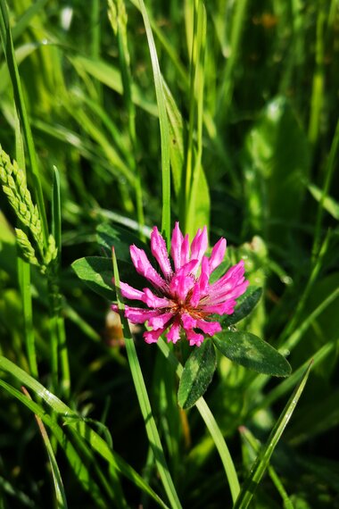 Als ich den Wald durchquert habe, eröffnet sich ein wunderschönes Plateau, auf dem sich das historische Bergwerk befindet. Ich beschließe den Moment zu genießen und lasse mich gemütlich auf einer Bank nieder, packe meine Fotokamera aus und halte die wunderschöne Aussicht auf die markanten Gipfel des Rätikon fest. Die pinken Blüten des Wiesenklees verleihen meinem Foto das gewisse Etwas. Ich nasche eine Blüte, die zuckersüßen Nektar enthält. Auch im Obstsalat und auf Kuchen oder zum Aromatisieren von Sirup und Säften ist die Blüte des Wiesenklees köstlich.