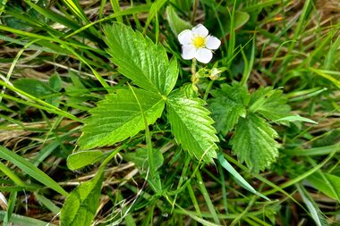 Ich biege auf ein kleines Wurzelweglein, das in einen Fichtenwald führt, ab. Ich habe Guster auf eine kleine Stärkung und blicke auf den Waldboden. Siehe da, ich entdecke ein paar Walderdbeeren. Zum Naschen zwischendurch aber auch als Marmelade schmecken sie vorzüglich. Die Blätter verleihen Salaten einen besonderen Pfiff und die enthaltenen Gerbstoffe lindern Entzündungen der Mundschleimhaut.
