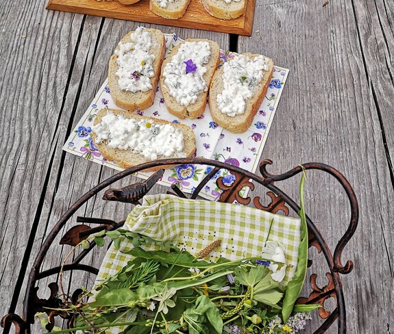 Ich setze meine Wanderung zum Fritzensee fort. Wunderschön eingebettet in die Maisäßlandschaft ist der Bergsee zu jeder Jahreszeit faszinierend. Er ist wertvolles Zuhause von Fröschen, Libellen und Molchen, die ich als Naturführerin liebend gern beobachte. Ich setze mich an die Hauswand eines Maisäß und packe meine Jause aus: frischer Topfen von unserem Bauernhof und selbstgebackenes Brot, das ich nun noch verfeinern will. Suchend nach einem passenden Bergkraut blicke ich zu meinen Füßen. Hurra, hier wächst die Schafgarbe. Sie eignet sich bestens für Kräutertopfen, Kräuterbutter, Salat und Suppen. Auch getrocknet als Kräutersalz und Tee findet sie Verwendung. Sie ist wohltuend bei Magen-Darm-Beschwerden und wirkt entzündungshemmend und entkrampfend. Verziert wird mein Kräuterbrötchen noch mit einer Gänseblume.