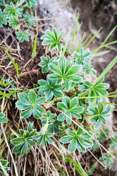 Wohl gestärkt und erholt begebe ich mich auf den Rückweg. Der Tag neigt sich langsam dem Ende zu und die letzten Sonnenstrahlen blinzeln zwischen den Bergspitzen hervor. Ich liebe das besondere Licht bei Sonnenuntergang. Ich lasse meinen Blick herumschweifen und stoße auf etwas silbrig Glitzerndes. Es ist der Silbermantel, auch Alpen-Frauenmantel genannt. Wie der Name schon vermuten lässt, wird dem Heilkraut eine besondere Wirkung in der Frauenheilkunde zugeschrieben. Reich an Pflanzenhormonen hilft der Tee aus den Blüten bei Frauenbeschwerden, Beschwerden der Atmungsorgane, Schlaflosigkeit und Kopfschmerzen.