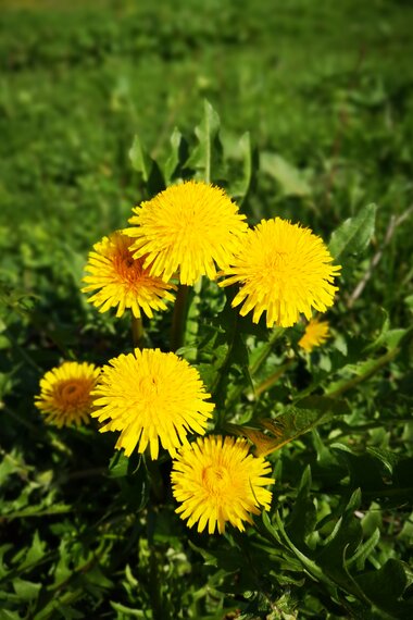 Reges Treiben herrscht auf dieser kunterbunten Blumenwiese. Die fleißigen Bienchen fliegen von einer gelben Löwenzahnblüte zur nächsten. Unglaublich, was sich in dieser Pflanze alles verbirgt. Die Wurzeln können zu geröstetem Wildkaffee verarbeitet werden, die jungen Blätter peppen jeden Salat auf und die gedünsteten Blütenknospen schmecken wie Rosenkohl. Als gelernte Konditorin stelle ich liebend gern Löwenzahnblütensirup und verzaubernde Löwenzahnmarmelade her. Löwenzahn ist entzündungshemmend, krampflösend und appetitanregend.