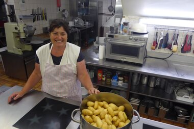 Nach der Lehre im Panoramagasthof Kristberg war sie für eine Saison am Hochjoch, bevor es sie in den Gasthof Löwen nach Tschagguns zog. Dort ist sie bereits seit 36 Jahren im Küchenteam dabei, das - eher untypisch - fast nur aus Frauen besteht.