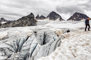 „Der Ochsentaler Gletscher, der größte seiner Art in Vorarlberg, ist seit 1850 stark zurückgegangen. Da er bis zu 150 Meter an Eisdicke verloren hat, ist dieser steiler, zerklüfteter und felsdurchsetzter geworden.“