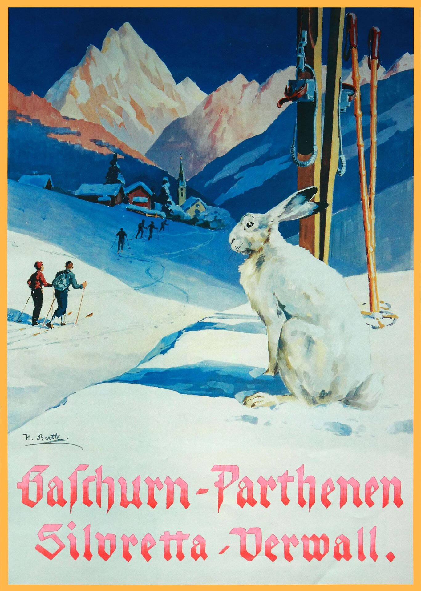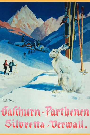 Etwas später - vermutlich in den 1920er Jahren - kam mit dem "Schneehase" ein weiteres Motiv für Gaschurn-Partenen vom selben Künstler hinzu.