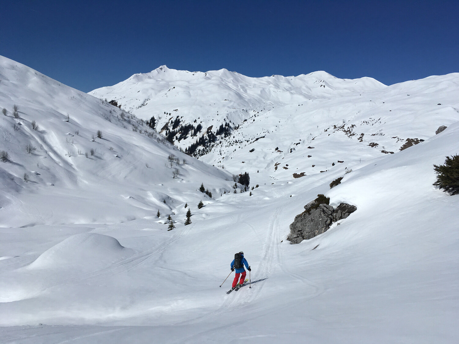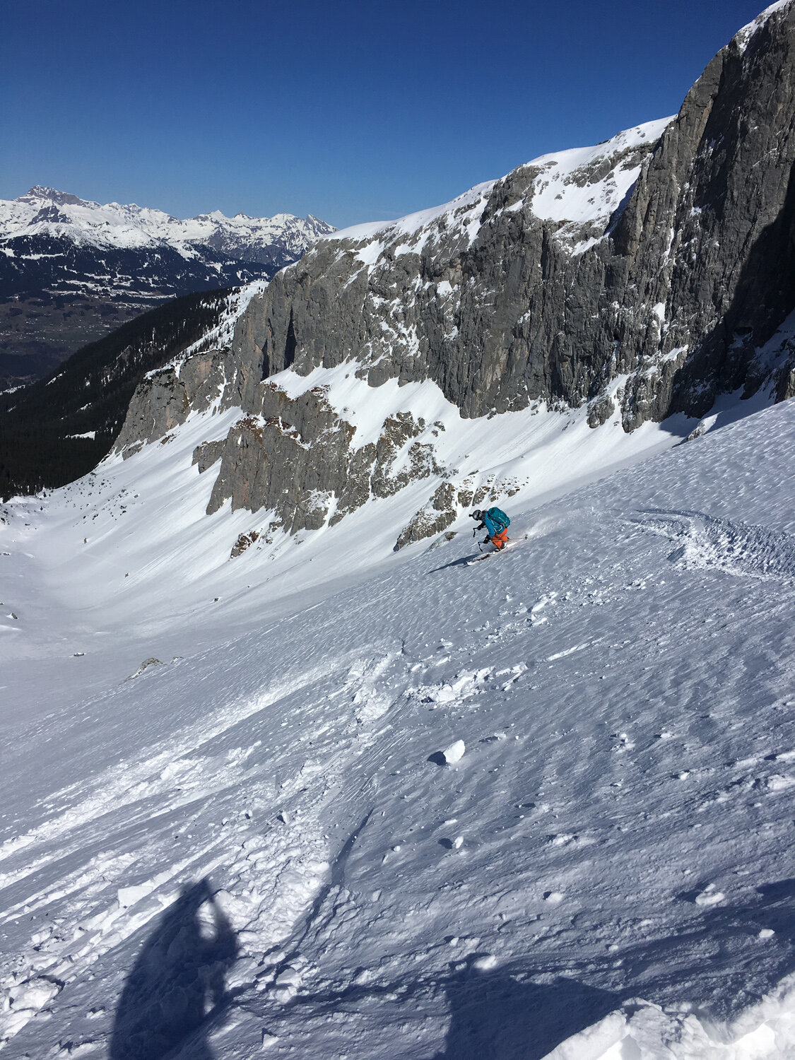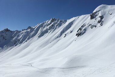 Mit Blick auf die Uhr beschlossen wir daraufhin jedoch das Gipfelkreuz auszulassen und lieber auf einen anderen Tag zu verschieben. Doch selbst vom Riedkopfjoch aus hatten wir einen guten Blick auf ein paar der mächtigen Rätikon Gipfel wie z.B. Wiss Platte, Sulzfluh und Drei Türme. Und natürlich auf die erste lange Abfahrt des Tages: gute 700 Höhenmeter und 4 Kilometer hinunter Richtung Partnunstafel.