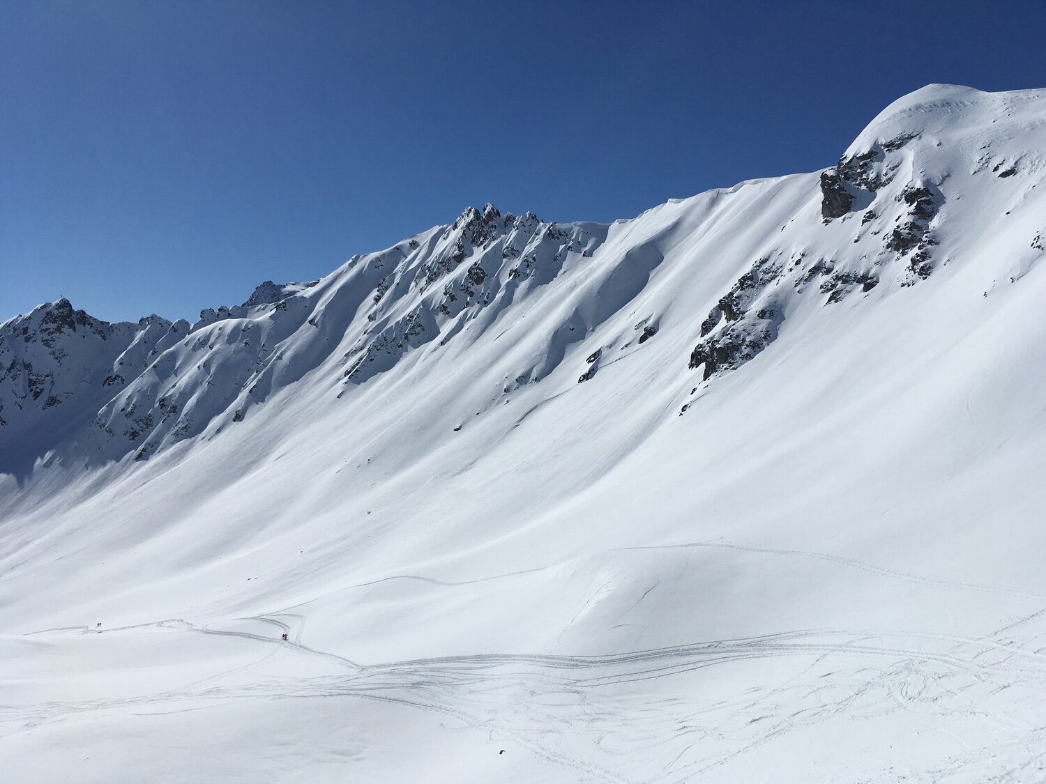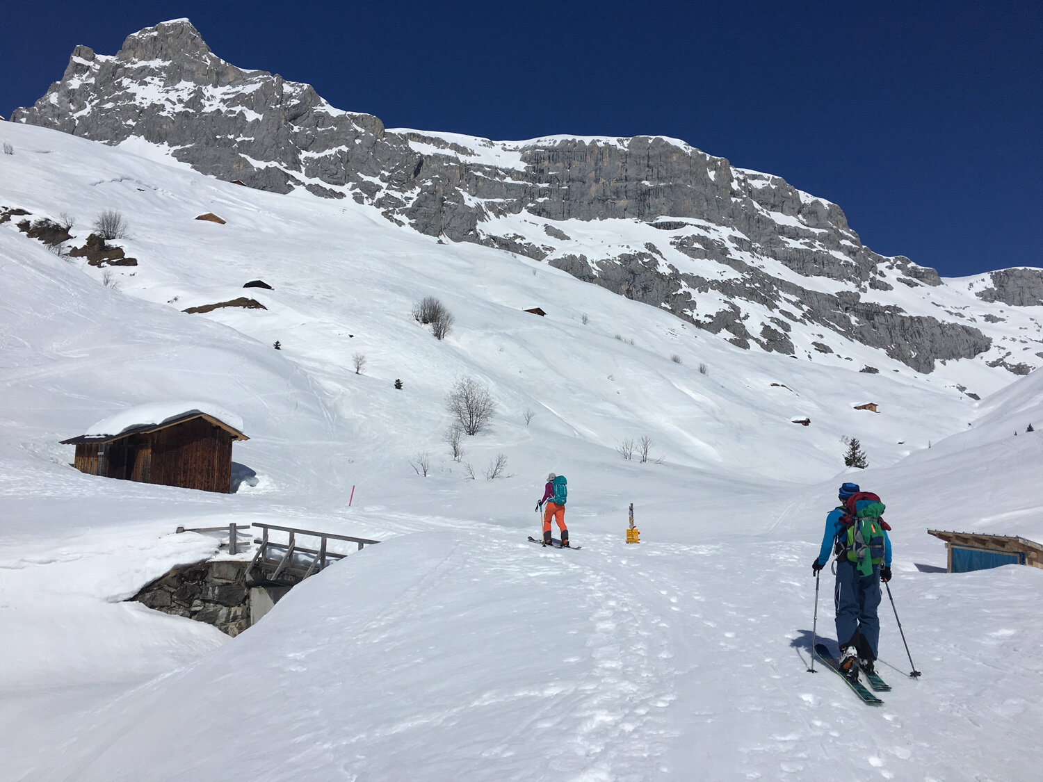 Danach folgten wir den langen, sanft kupierten Hängen (je nach Himmelsrichtung pulvriger bis knuspriger Schnee) und dem Talboden in westliche Richtung. Um keine Höhenmeter zu verlieren, traversierten wir auf der rechten Teilseite oberhalb von Partnun mit seinen tief verschneiten Dächern bis zum Berghaus Alpenrösli. Deren verlockende Terrasse mussten wir sprichwörtlich links liegen lassen.