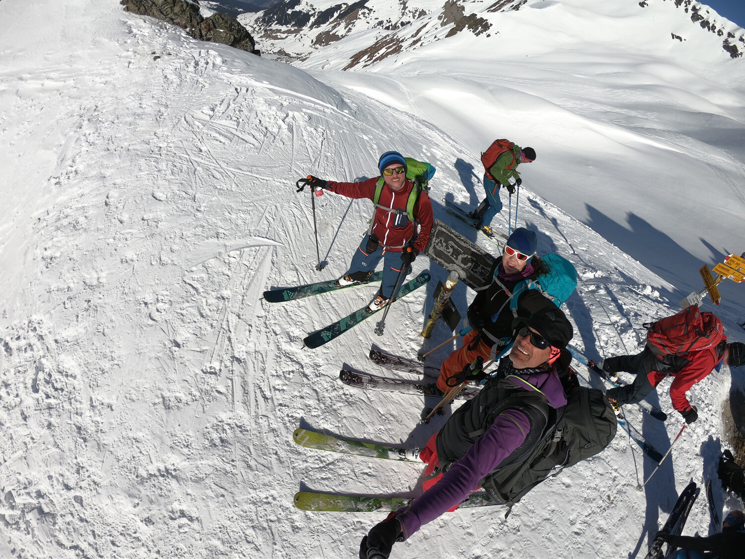 Wir waren schon fast oben angekommen, da passierte ein kleines Malheur: Dirk wurde von einer plötzlichen Windböe sein geliebter Hut vom Kopf gerissen und in einen Hang Richtung Gargellen geweht. Was nun? Hinterherjagen oder nicht? Haben wir die Zeit dafür? Da es ein Andenken aus Chamonix war, kam nur Hinterherjagen in Frage. Doch zu lange durfte das nicht dauern, schließlich hatten wir noch eine gute Strecke vor uns. Mit Hilfe unserer Anfeuerungsrufe gelang die Mission Hutrettung in Rekordzeit. Puh, noch mal Glück gehabt.