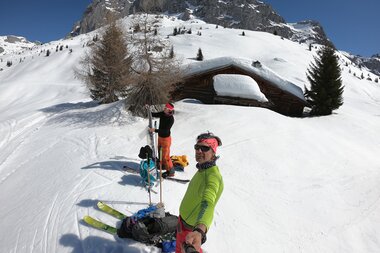 Landschaftlich spannend, führte er uns zwischen schroffen Felsformationen hindurch, immer die so völlig anders aussehende Rückseite der Drei Türme im Blick. Als wir gegen 14:00 Uhr die Grenze nach Österreich überschritten, war die Freude groß, denn im Geiste sahen wir uns schon beim kühlen Radler relaxen... Doch zuvor gab es erst noch die wohlverdiente Belohnung in Form eines langen, nordseitigen Pulverschneehangs, der uns im Endorphinrausch geradewegs auf die Sonnenterrasse der Lindauer Hütte beförderte. Besser konnte es nicht laufen.
