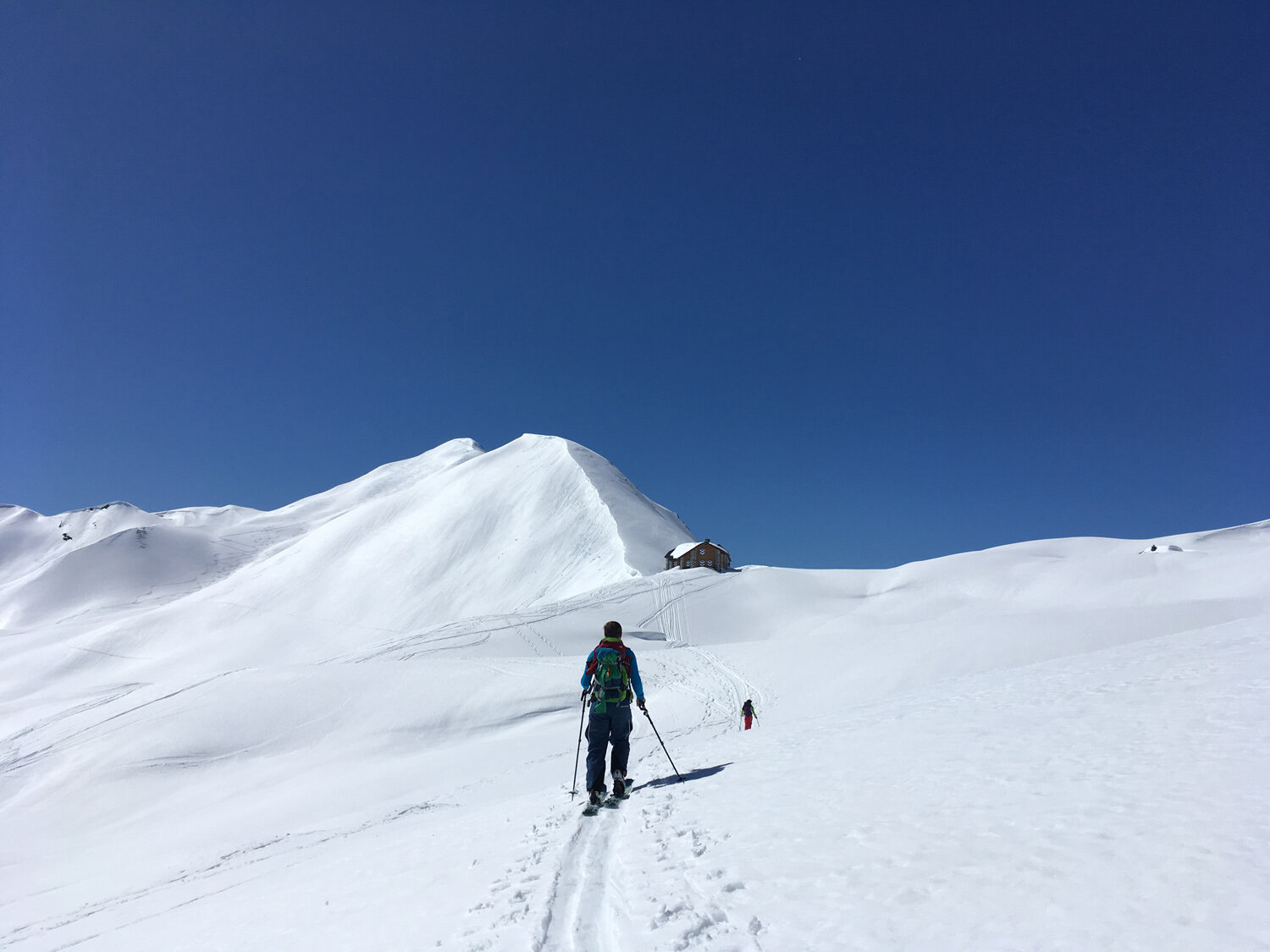 Die pralle Sonne ließ uns ordentlich schwitzen. Der Schneedecke hatte die Temperatur noch nichts getan, aber die Sonnencreme musste im Halbstundentakt neu aufgetragen werden und uns wurde es einfach nur warm. So warm, dass die beiden Jungs wie ferngesteuert zur Hütte liefen (dort baumelte wohl ein Bier an einer Angel). Die Enttäuschung war groß, als die Hütte geschlossen und somit der Traum der Karotte, pardon dem Kaltgetränk, platzte. Und so gab es stattdessen warmen Tee aus dem Rucksack und dazu einen Energieriegel, der für die letzten 45 Minuten Aufstieg zum Drusator ausreichen musste.