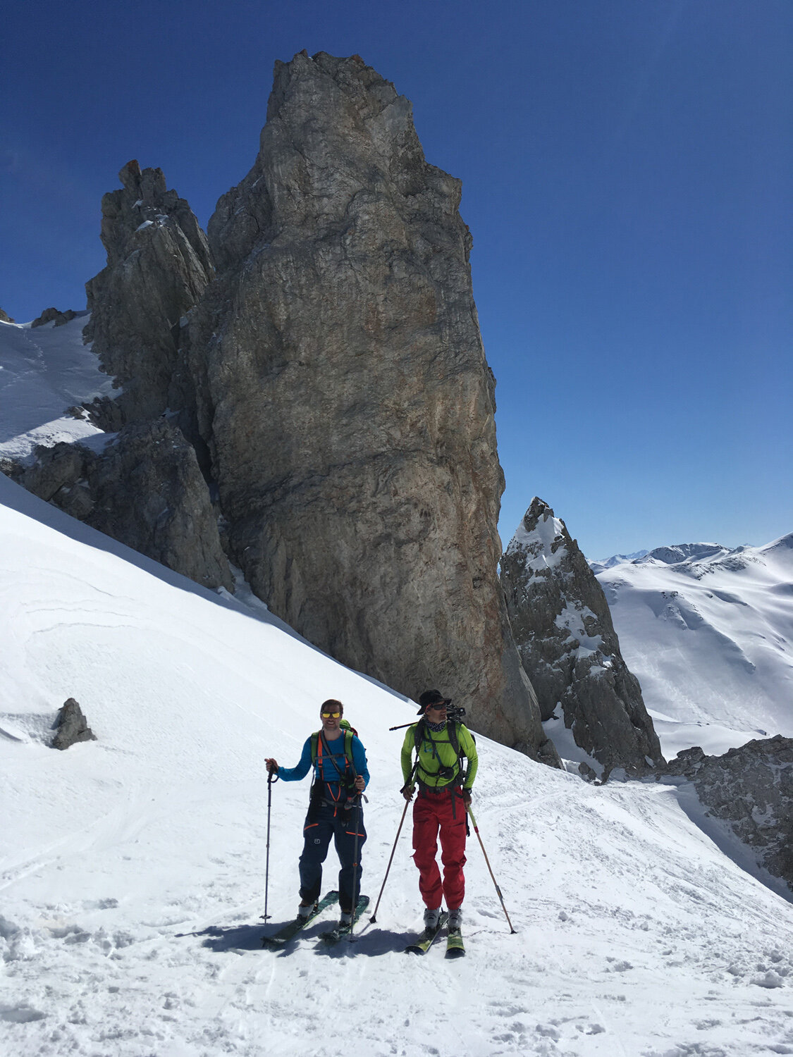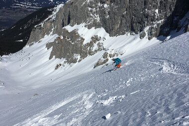 Mit breitem Grinsen im Gesicht stürzten wir uns gegen 10:30 Uhr nacheinander die etwas steilere, aber sehr breite Nordrinne hinunter. Sie war genau nach unserem Geschmack: Wunderbar griffiger Schnee, etwas ausgefahren, hier und da ein Buckel.