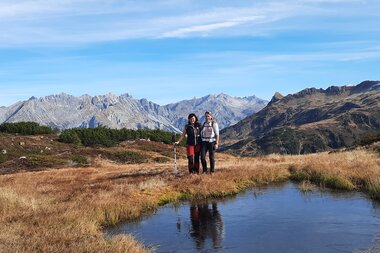 Auf unseren letzten Metern nach oben werde ich aus den Gedanken gerissen, der Blick gibt ein immer größeres Panorama frei. Gegipfelt durch die 360°-Rundumschau ganz oben, am Muttjöchle-Gipfel. Dank meiner Wanderführerin hat jeder Peak dann auch gleich ein Namensfähnchen erhalten. Da kann so manche App einpacken, um neue Ziele auszumachen. Der Blick reicht vom Brandnertaler Gletscher, der Zimba, weiter über Bartholomäberg, hinüber in den Bregenzerwald und das Lechgebirge bis hin zum Gebirge der Silvretta.