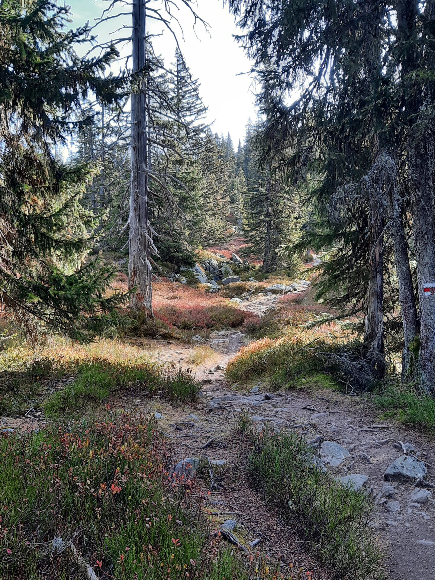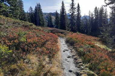 Die frische Herbstluft hier oben – die Tour scheint wie geschaffen, um die Welt der Sinne zu erkunden. Die Preiselbeeren schmecken auf der sonnenbeschienenen Hochfläche ungleich süßer als weiter unten. Dass es auch entscheidend sein kann, die Farbe Blau von Weiß unter der Schale von blauen Beeren zu unterscheiden und sich so für Genuss statt Bauchweh zu entscheiden, geht auch auf Imeldas Konto: Danke für die leckeren Heidel- statt Rauschbeeren am Weg.
