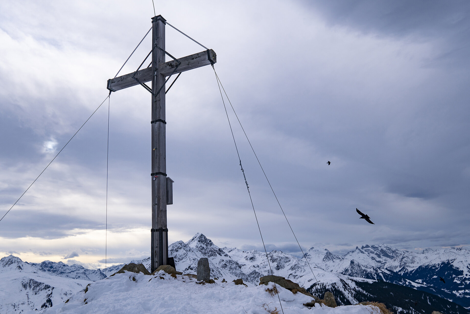 Raus aus dem Schutz des Waldes machten wir auch heute erstmals Bekanntschaft mit dem Föhn. Was dann teilweise das Wechseln der Jacke nicht so gaaanz einfach machte. Aber auch wettermäßig gab es heute eine geniale Stimmung. Die Sonne wechselte sich mit den Föhnwolken ab. Aus fotografischer Sicht hätte es nicht besser sein können. Deshalb blieben wir ab und an stehen, um zu fotografieren und die Landschaft wirken zu lassen. Beobachtet von dem einen oder anderen fliegenden Begleiter, gingen wir dann weiter Richtung Gipfel. Ich bin ja immer noch der Meinung, dass es schon die Geier waren.