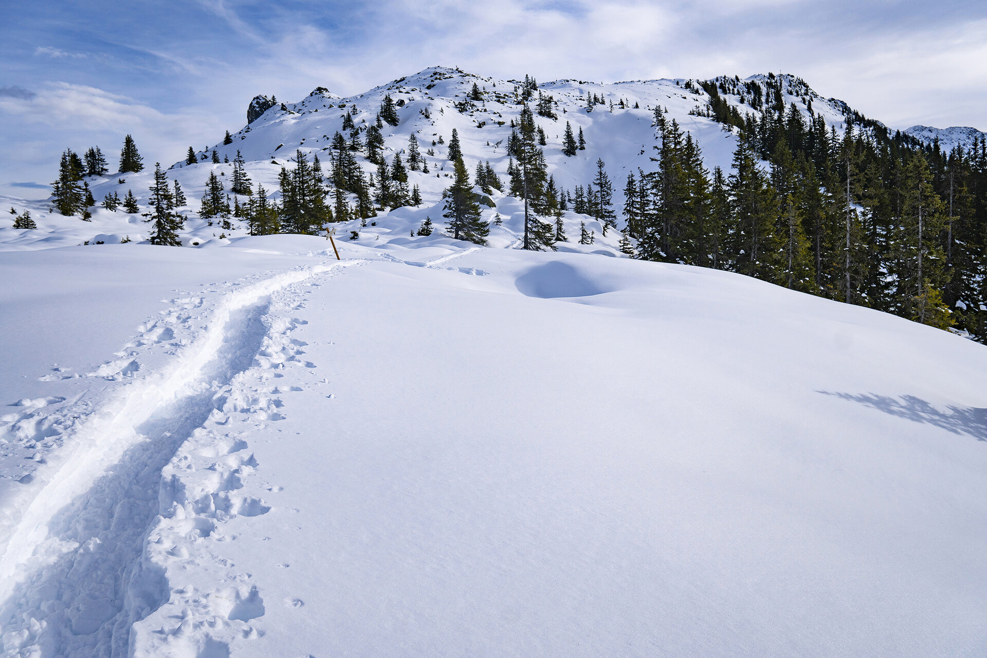 Dann machten wir uns wieder auf den Rückweg. Und was sehr überraschend war: wie schnell der Wind die Spuren verweht hat. Teilweise waren sie überhaupt nicht mehr vorhanden, was bei dieser Tour aber kein Problem war. Wir genossen den Weg zurück samt gewaltiger Aussicht auf die umliegenden Berge und gleiteten quasi wie auf Wolken durch den Tiefschnee den Berg hinunter. Auf halbem Wege gönnten wir uns dann aber doch noch eine Pause, damit wir unsere Jause nicht ganz umsonst dabeihatten.