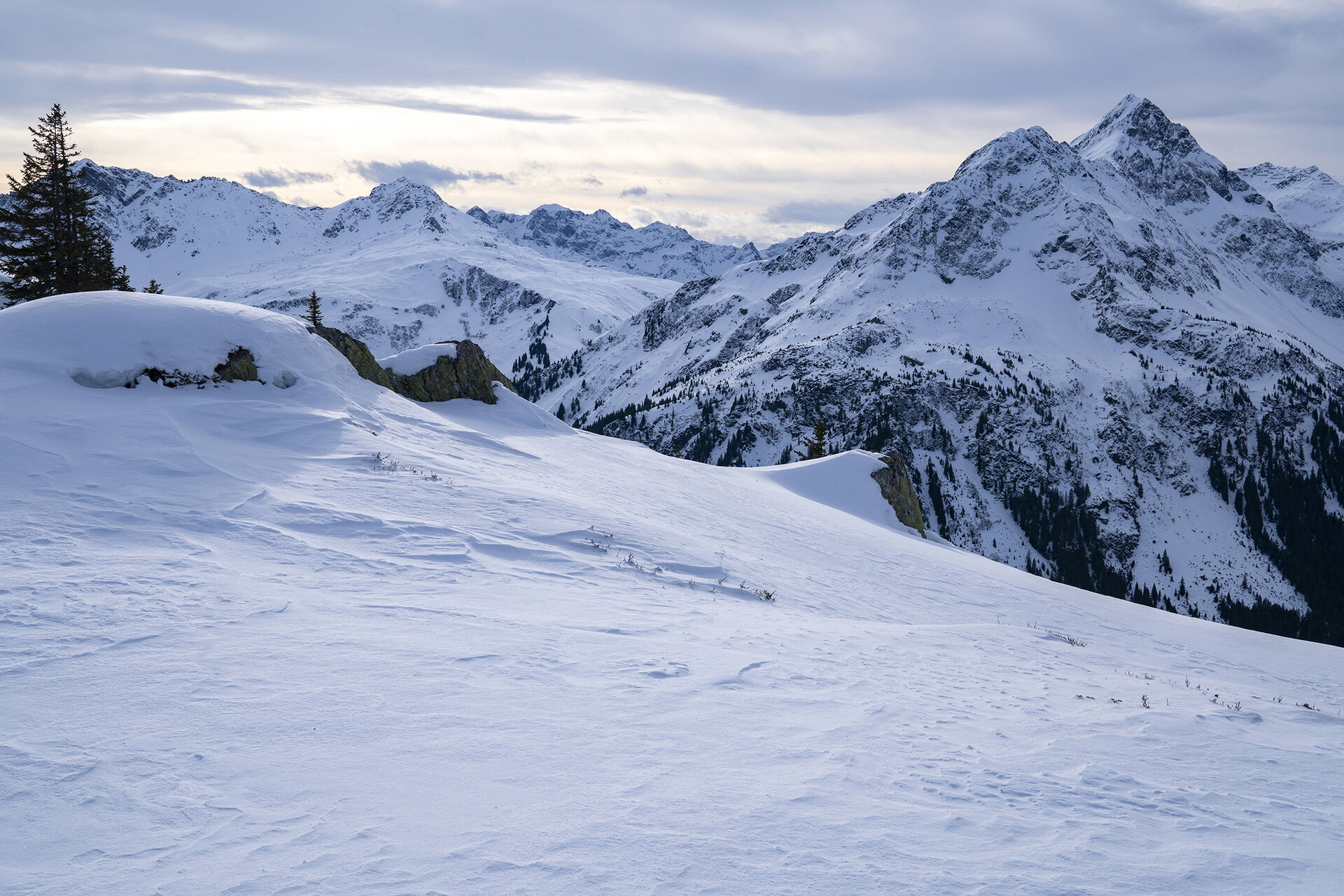 Wir fuhren in der Früh mit der Kristbergbahn hinauf und mussten feststellen, dass der Föhn in den letzten Tagen seine Spuren hinterlassen hat. Somit schnallten wir für die ersten Höhenmeter unsere Schneeschuhe an die Rucksäcke. Bei perfekten Schneelage kann man gleich von der Bergstation mit Schneeschuhen losstapfen.