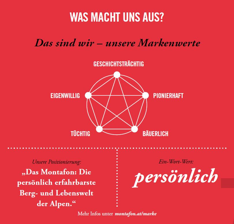 Die Berge stehen also im Mittelpunkt. Gleichzeitig ist der Tourismus im Montafon mit einem hohen Anteil an Ferienwohnungen und Gästebetten sehr klein strukturiert. Das wiederum fördert den persönlichen Kontakt zwischen Gastgebern und Gästen. Diese beiden – die Bedeutung der Berge und die persönlichen Beziehungen – sollen nun miteinander verbunden und für die Gäste in Form von Bergerlebnissen unkompliziert und einfach erlebbar gemacht werden. Daher lautet die zentrale Positionierung: „Das Montafon: Die persönlich erfahrbarste Berg- und Lebenswelt der Alpen“.