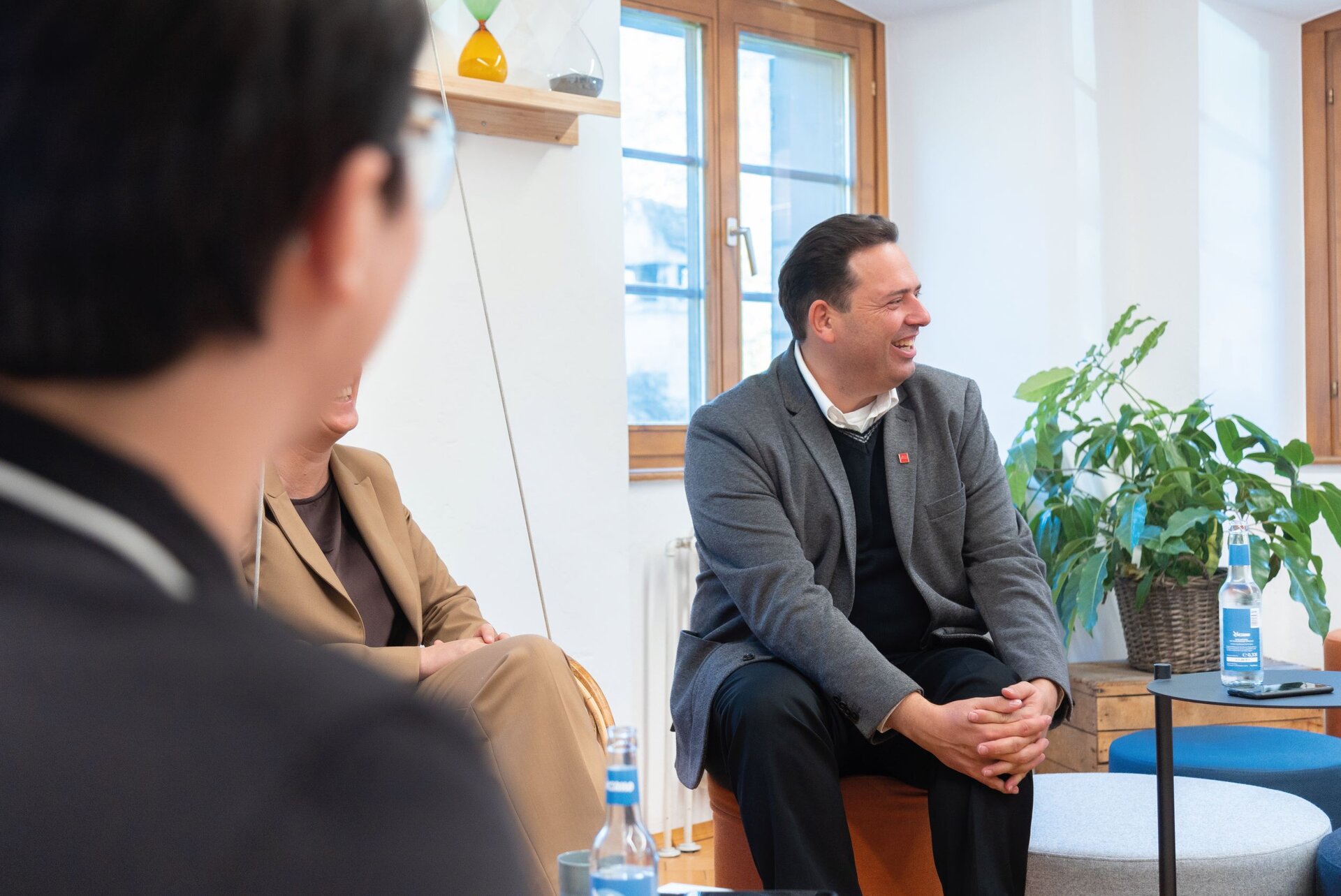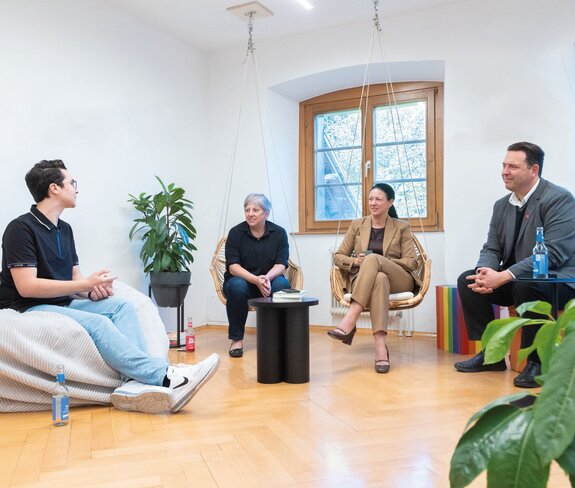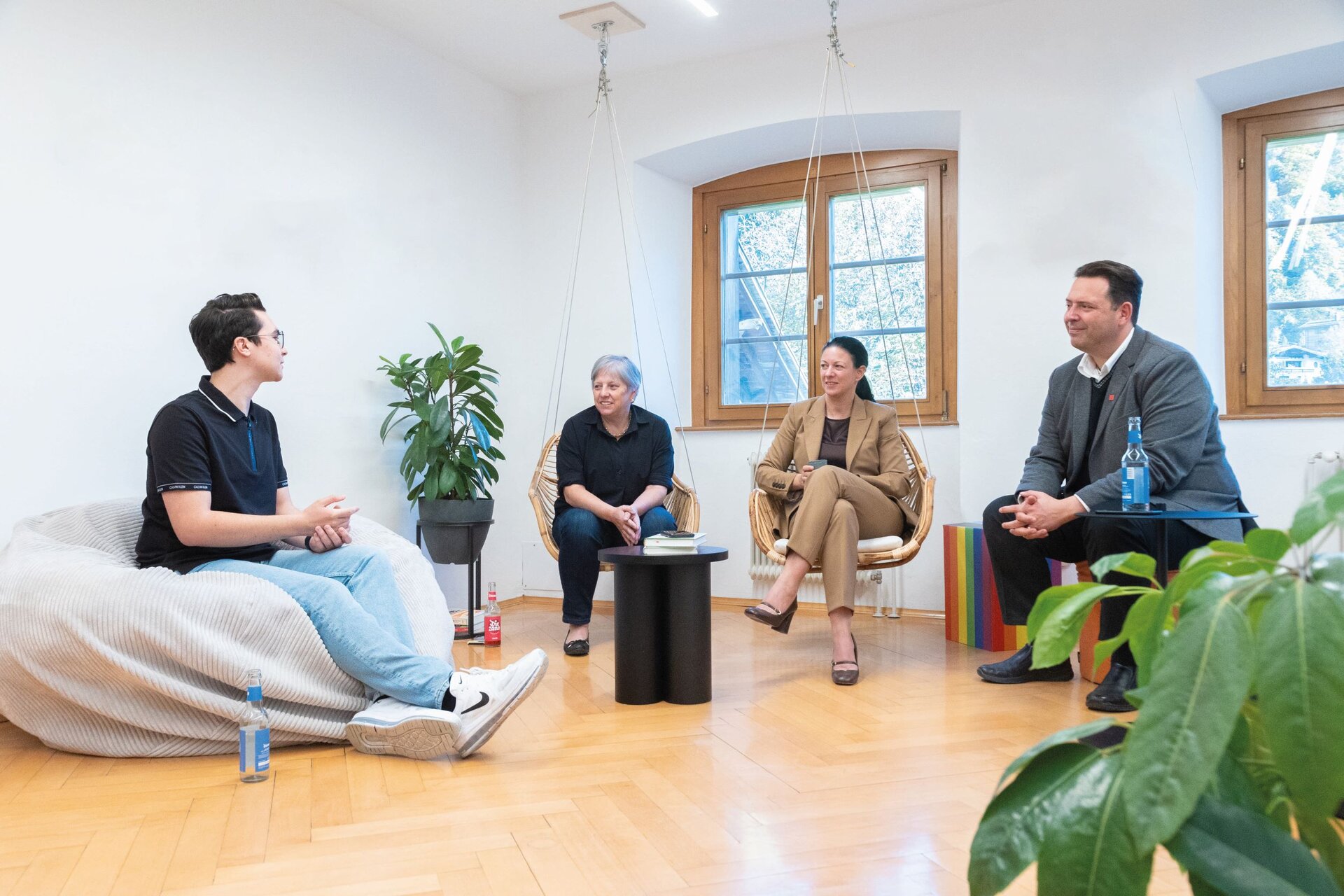 Im Gespräch mit Adrian Bargehr, Schüler und stv. Schulsprecher Tourismusschulen Bludenz, Heike Ladurner-Strolz ÖHV Landesvorsitzende Vizepräsidentin und Gastgeberin, Nicole Okhowat-Lehner, Direktion GASCHT- Gastgeberschule für Tourismusberufe und Manuel Bitschnau, Geschäftsführer Montafon Tourismus GmbH, (v. li. n. re.).