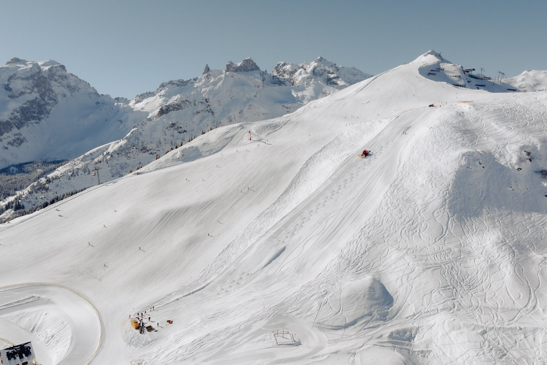 Vergangenen Freitag haben wir mit den ersten Arbeiten für den Streckenbau begonnen. Aktuell sind bis zu drei Pistengeräte im Einsatz, um die Piste zu präparieren. Die technische Beschneiung läuft außerhalb der Betriebszeiten. Derzeit arbeiten fünf bis sechs Mitarbeiter der Gargellner Bergbahnen an der Rennstrecke.