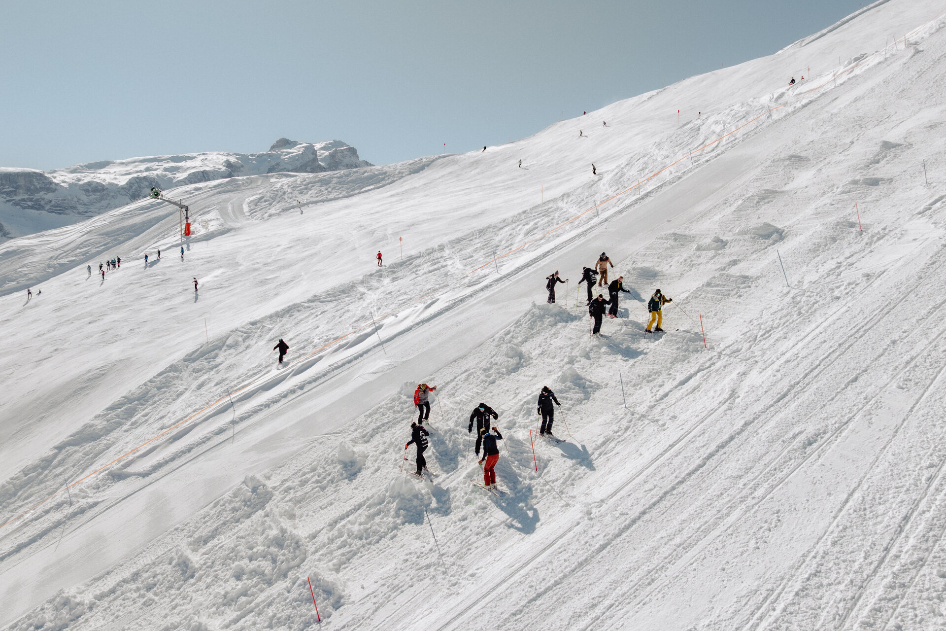 Die Schneequalität ist ein weiterer entscheidender Faktor, der jedoch nur begrenzt beeinflussbar ist. Idealerweise ist der Untergrund hart und gefestigt, damit die Pistenraupe nicht zu tief einsinkt und eine stabile Basis für die Buckelstruktur bietet. Die obere Schneeschicht wird aufgeraut, um die nachfolgenden Handarbeiten – wie das Formen und Anpassen der Buckel – zu erleichtern.