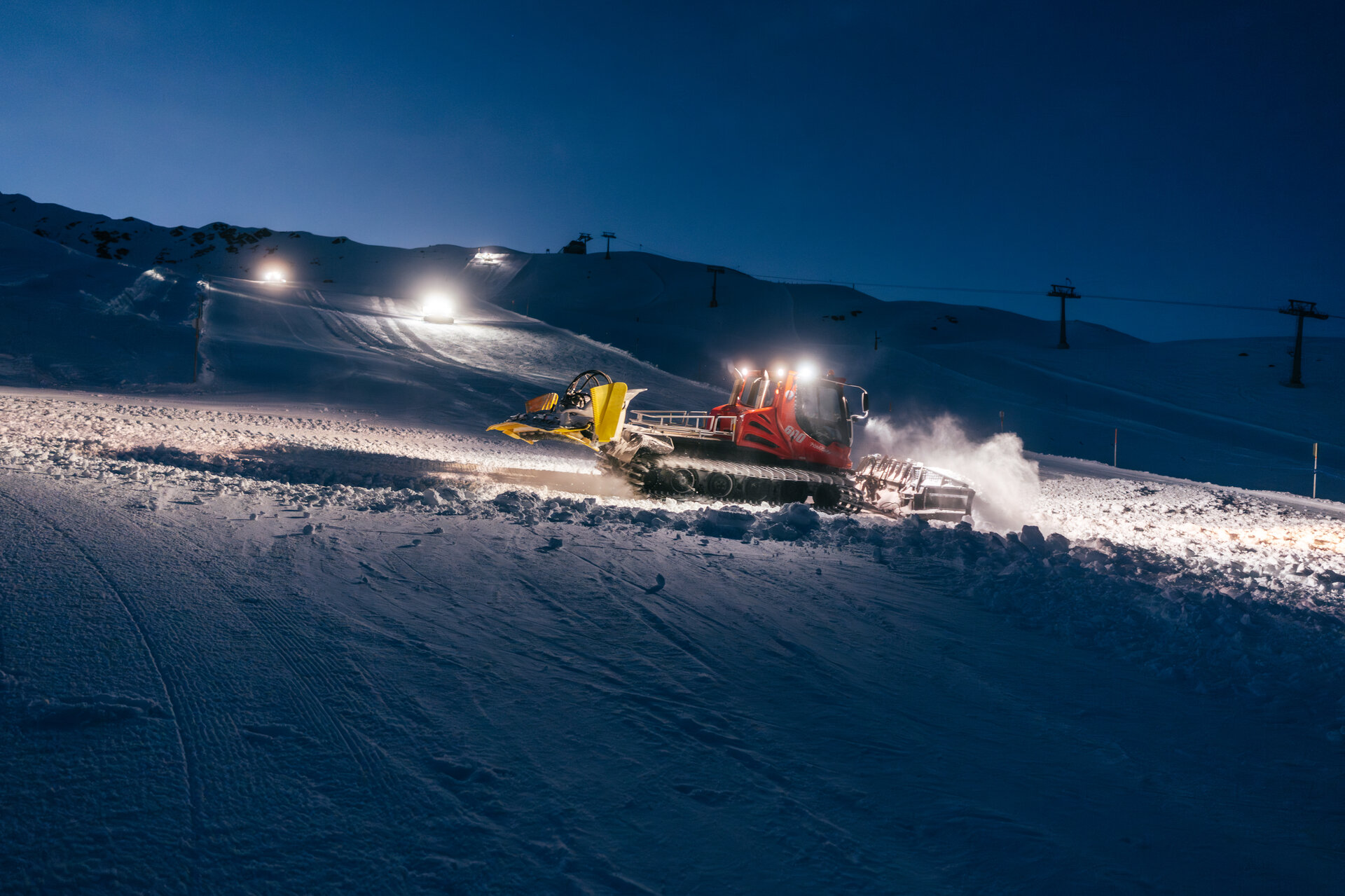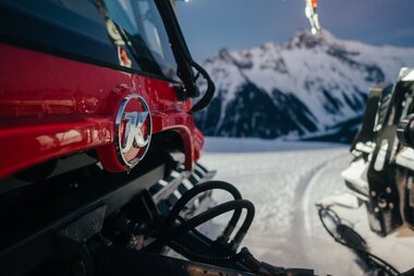 Die Steilheit der Piste ist hingegen gut zu bewältigen, da wir mit modernen Seilwindenraupen arbeiten. Eine zweite Pistenraupe steht am Start bereit und sichert die Arbeitsmaschine mit einer Seilwinde ab, wodurch auch steile Abschnitte sicher und präzise bearbeitet werden können.