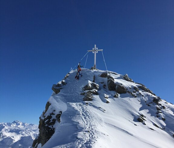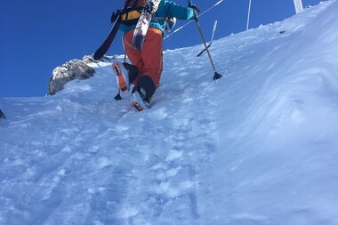 Die Hälfte konnten wir schiebend überwinden, doch an einem Punkt mussten wir dann die Ski am Rucksack festmachen und zu Fuß weiter laufen. Am Ende der Strecke gab es fürs Abenteuerfeeling noch eine kleine Kletterei am Drahtseil. Schwupps, die letzten Meter hoch zum Kreuz und der anstrengende Teil war geschafft.