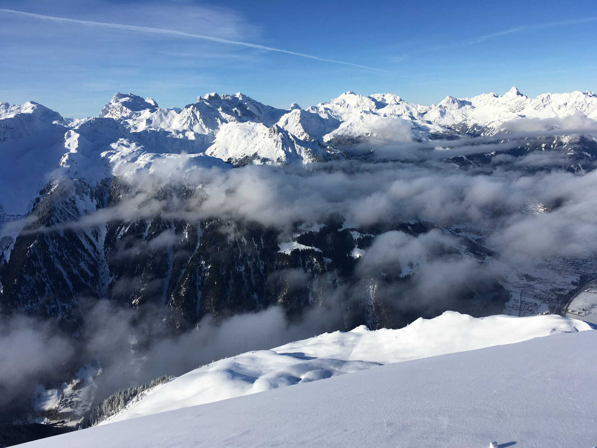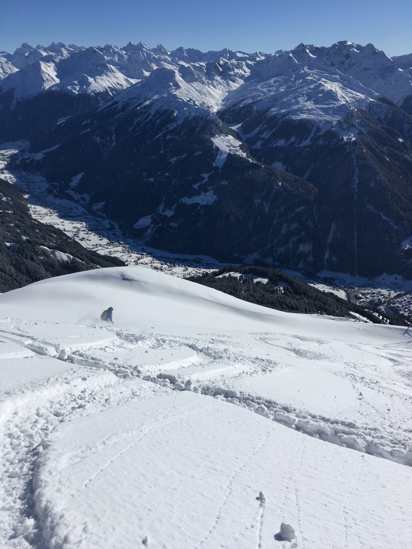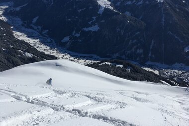 Gefühlte 20.000 Fotos später ging es endlich los. Zuerst fuhren wir Richtung Südwesten ein Stück am Grat entlang bis zu einem traumhaften Pulverschnee Hang mit Blick ins Tal. Nacheinander zogen wir unsere Spuren in den unberührten Tiefschnee. Ein Blick zurück und schon ging es im kupierten Gelände zwischen Latschen und Büschen hindurch weiter. Und schließlich wurde es mal kurz steil, um dann wieder in einem weiten flacheren Hang zu münden. Die Lawinengalerie wurde dabei großräumig umfahren. Nicht ohne Grund, denn die Hänge rutschen gern ab.