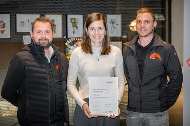 Eine Dame hält ein Zertifikat in der Hand und ist von zwei Herren umgeben | © WKV Sparte Tourismus, bobdo.com GmbH